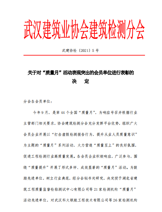熱烈祝賀武漢科正工程技術(shù)有限公司在2021年9月"質(zhì)量月"活動中獲得先進單位的榮譽!